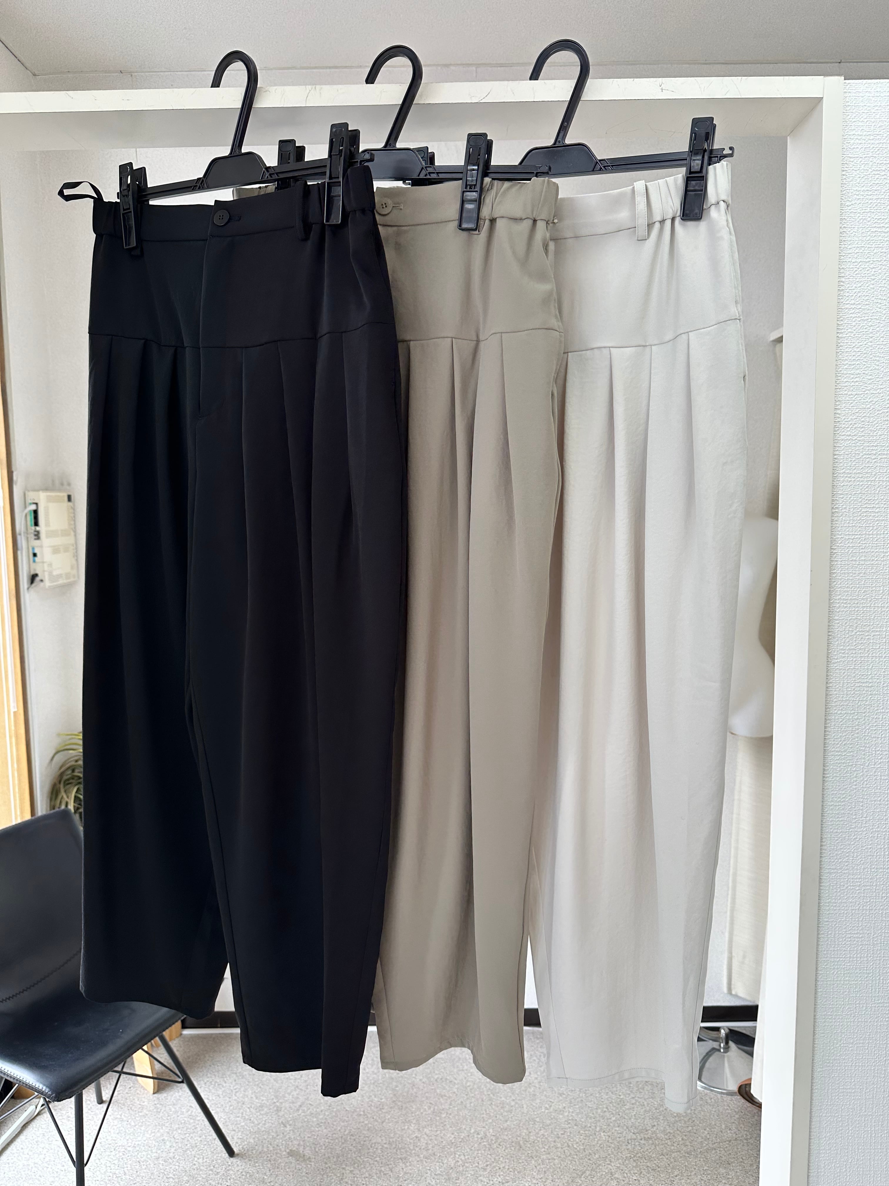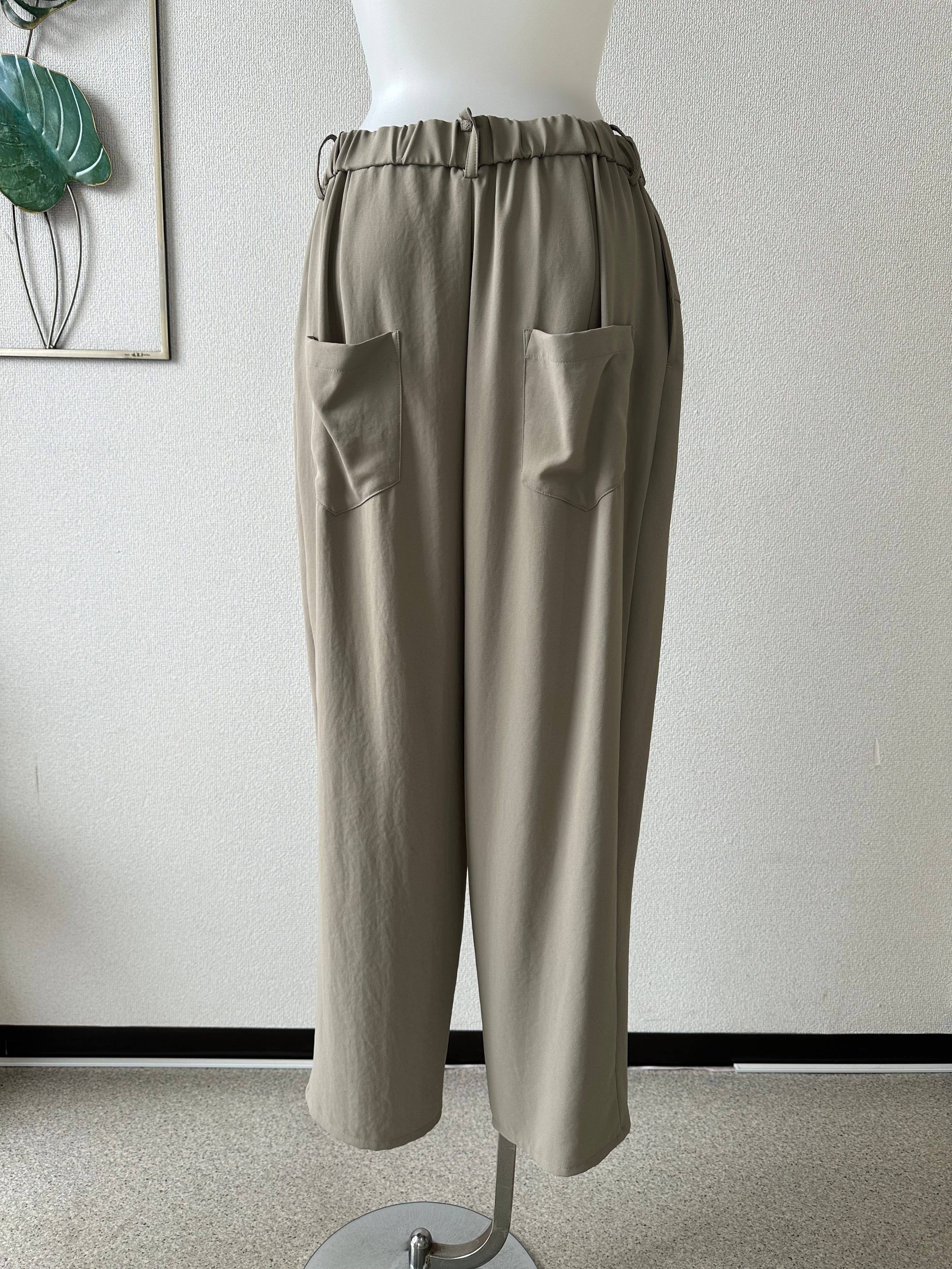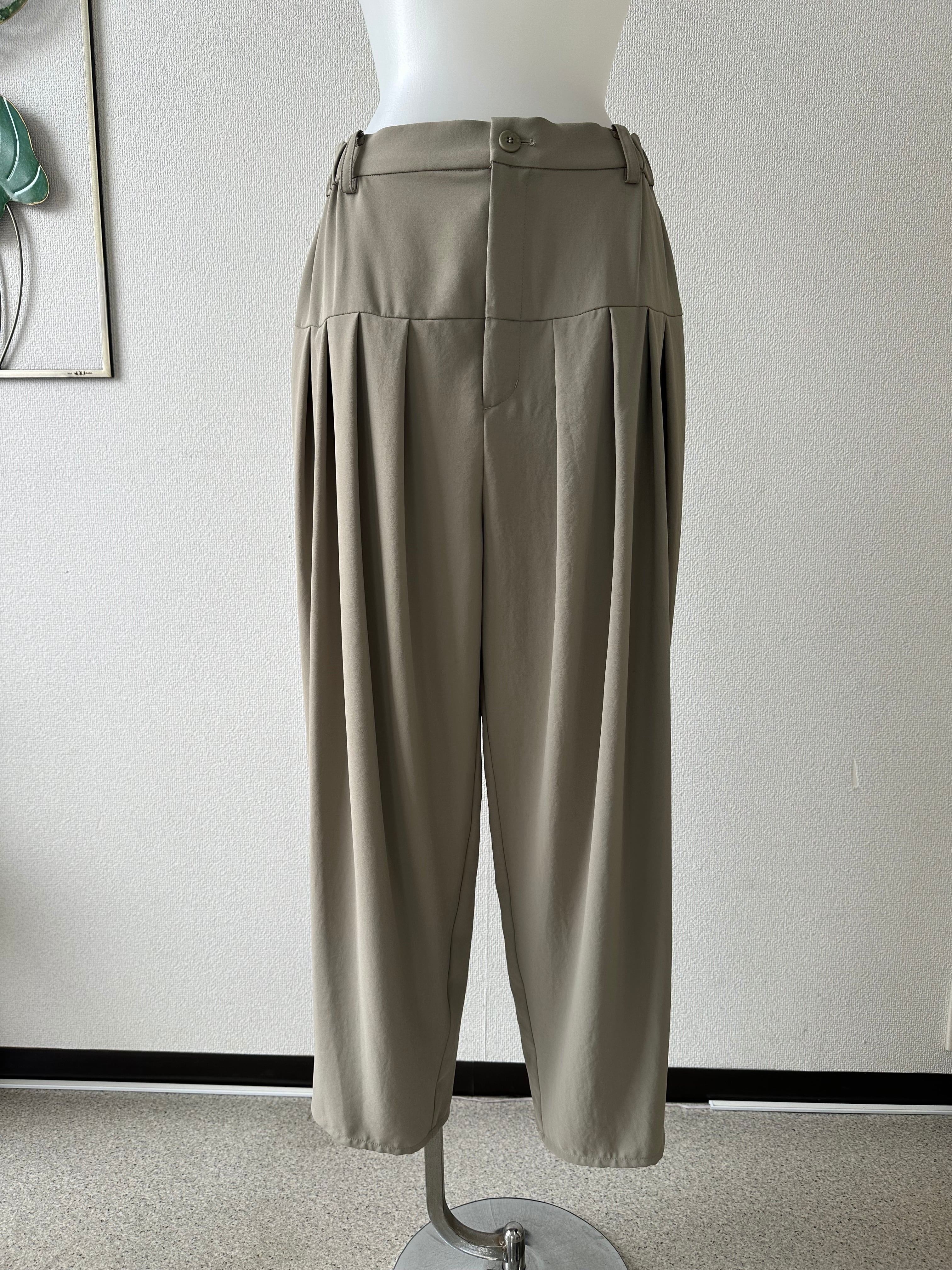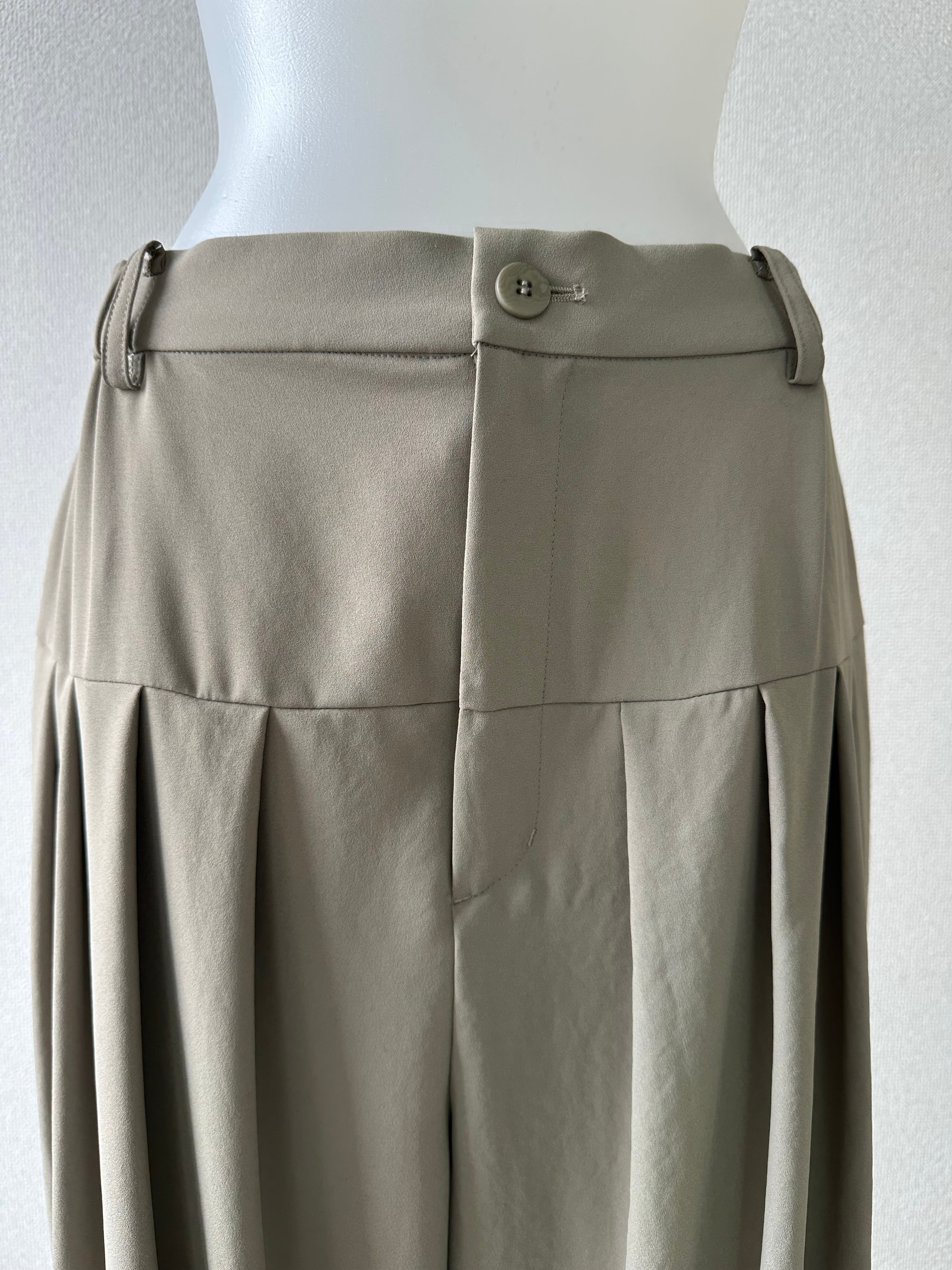 フロントはお腹周りをすっきりと仕上げ、切り替え下に配した多めのタックが腰まわりと太ももに立体感を生み出します。